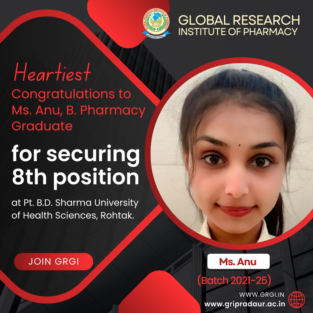 Ms. Anu, a brilliant student of the Global Research Institute of Pharmacy (GRIP), has secured the